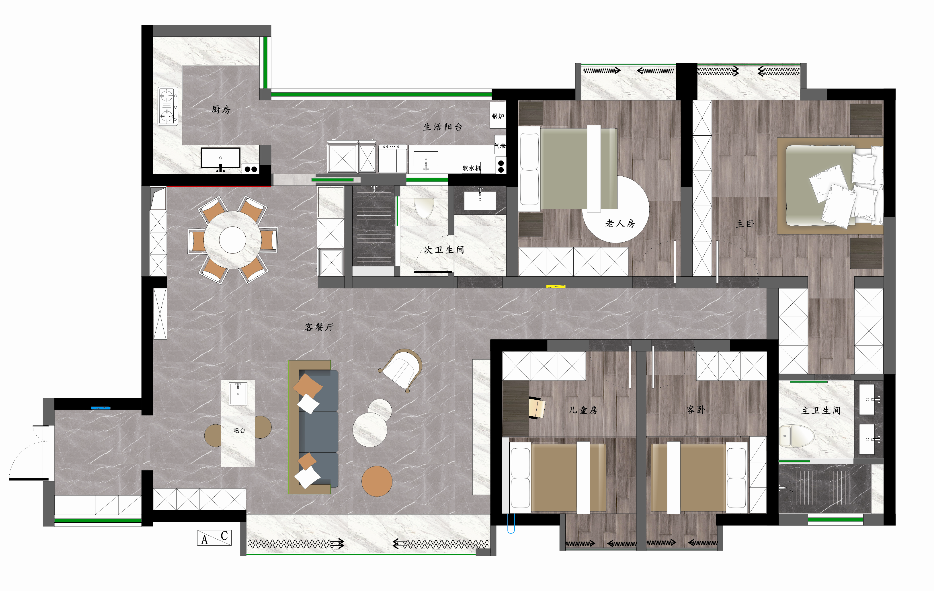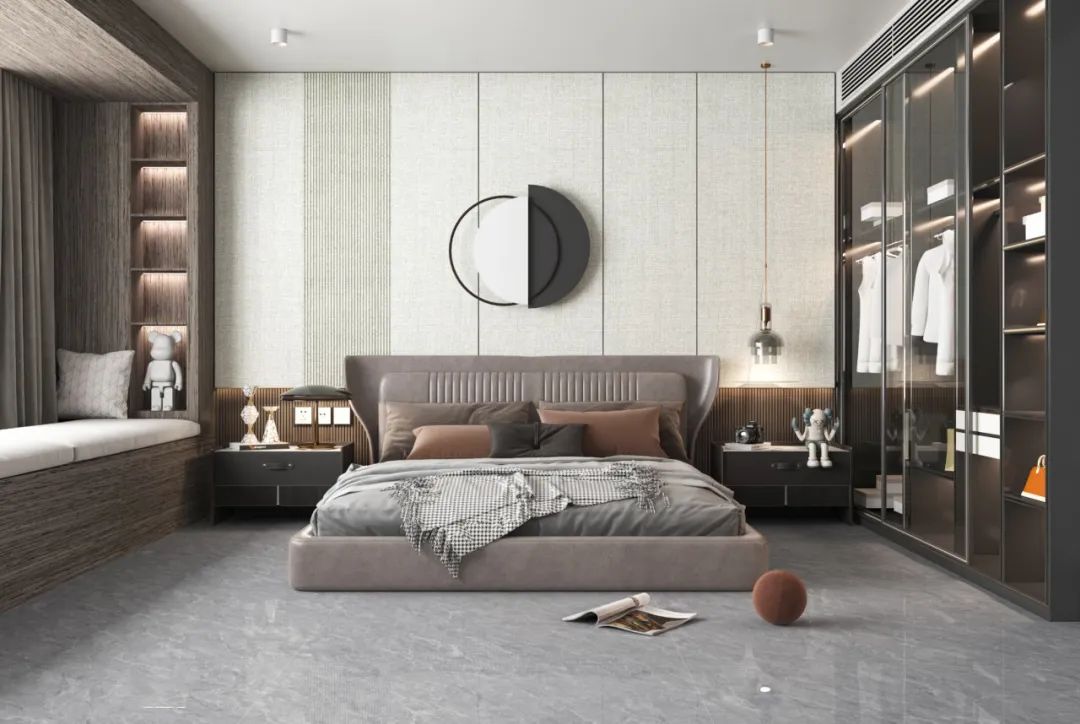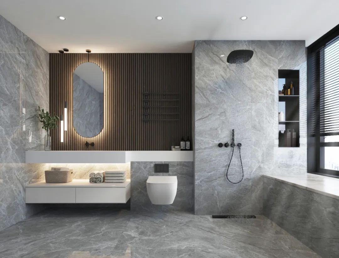 主衛采用大面積的灰色調彰顯空間的氛圍感,也延伸了視覺感,在木色鏡子的闌珊格的加持下,讓空間的層次更加豐富,觥籌交錯透露著品質和追求。