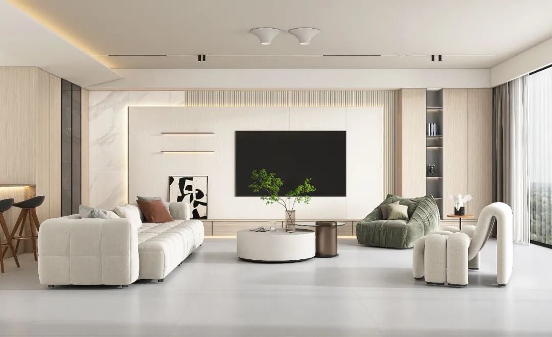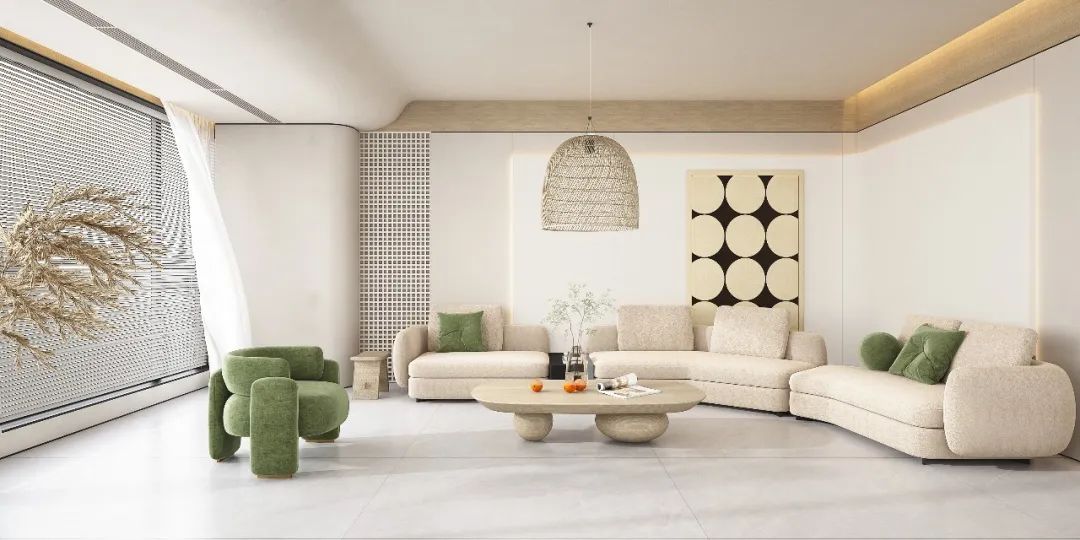 純凈的米色調讓整個空間輕盈且放松,電視墻柜以柔和細膩的瓷磚大板與有序的柵格線為主導,流線干凈,界面連貫,既顯高級又不乏豐富層次;嵌入恰到好處的布藝沙發,輔以一株綠意盎然的綠植,讓客廳變得更有溫度。
