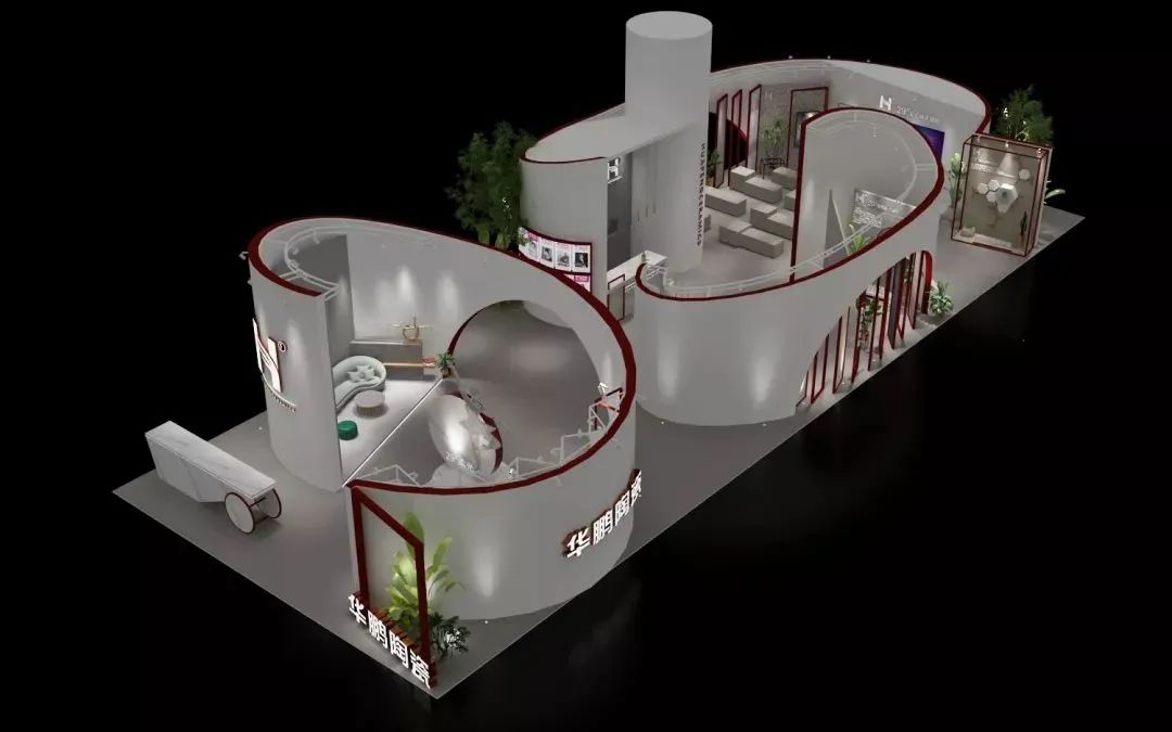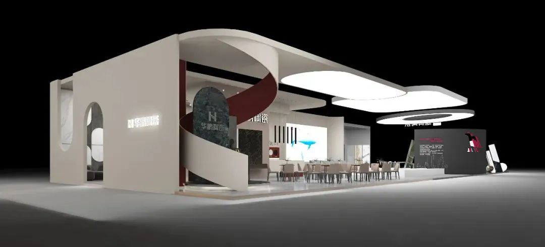 2020年廣州設計周展會,華鵬陶瓷品牌館延續29°柔光磚的產品特性和品牌調性,以「柔光之美」為主題,展館整體采用開放式的形式,弧形的應用,使整個空間更加柔和靈動,凸顯“柔光之美”的特性。