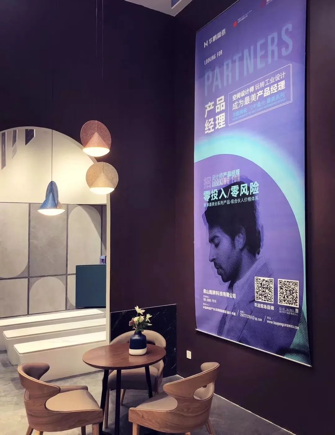 2019年展位聚焦展位聚焦升級亮相的柔光5.0奢石系列新品,設計周展位以“柔奢·而生”為主題,既寓意華鵬新生,又傳遞華鵬更高端奢級的品牌形象。通過產品的絲滑觸感,柔和舒適的觀感,通過陶瓷與不同材料的碰撞共鳴,共同展現華鵬的奢級質感。