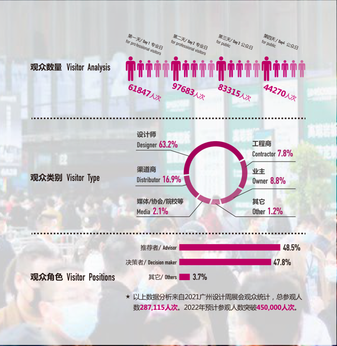 2021廣州設計周展覽規模擴增至18萬㎡,四天展會的參觀人數超預期達287,115人次,展覽以“當代人居生活美學新業態的設計+選材”為方向,聯動“廣州保利世貿博覽館、廣州國際采購中心、南豐國際會展中心“三館同期舉辦,史無前例的展覽規模和火爆人氣,使廣州設計周成為全國唯一規模不減反增的設計大展,再次穩居中國目前規模最大、參與人數最多、影響力最廣的設計產業年度營商大展。