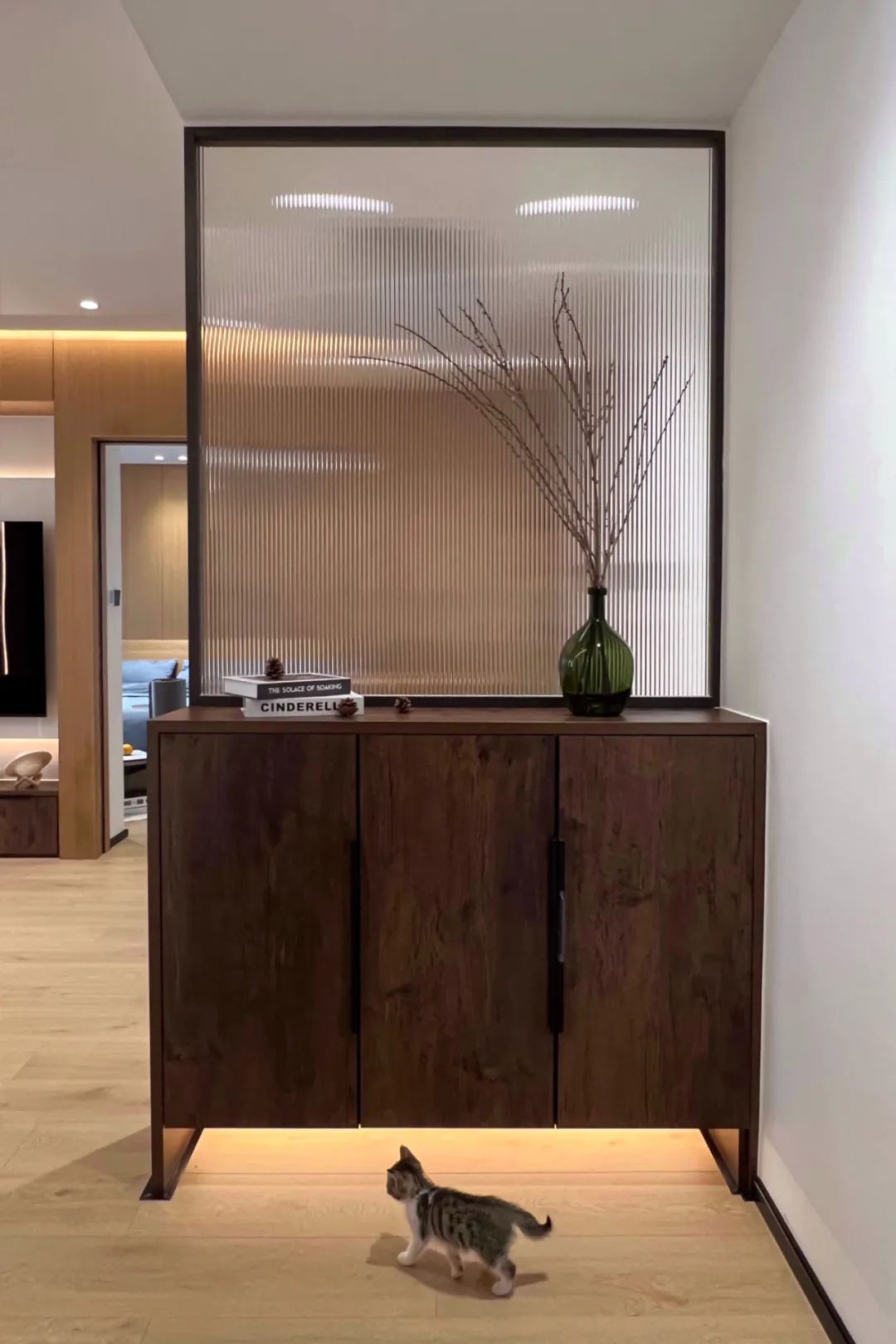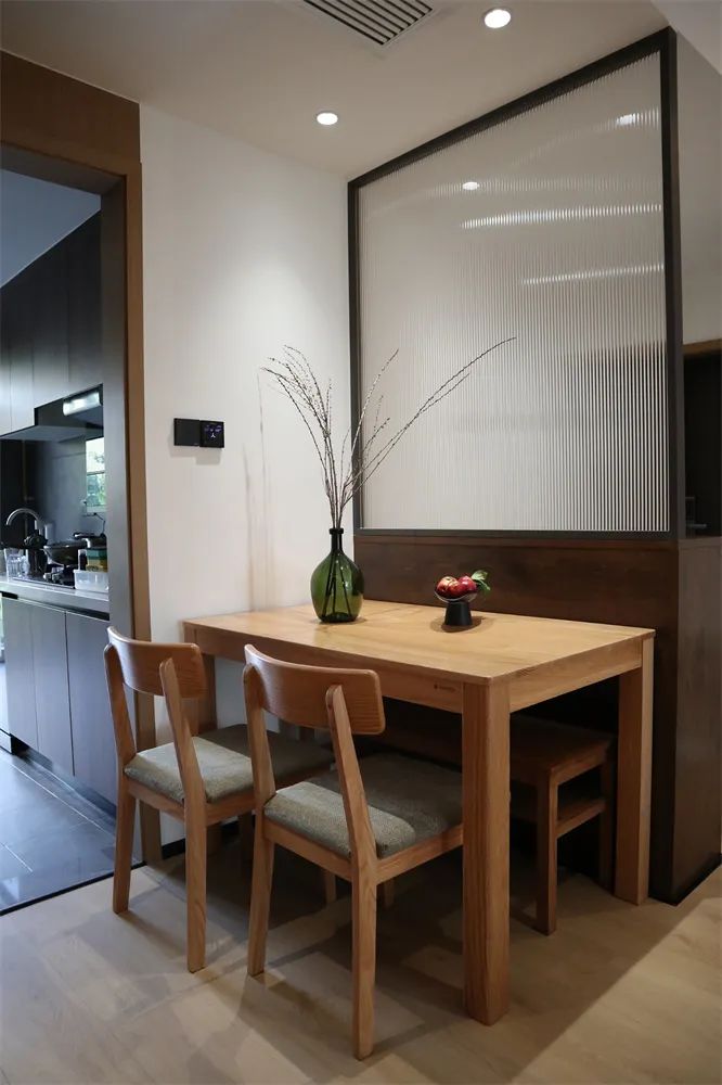 入戶玄關處的設計恰到好處,大塊的琉璃玻璃提升了空間的氣質及神秘感,在玄關處的背面設置一個小而精美的餐桌,呈現出別有不同溫馨氛圍。