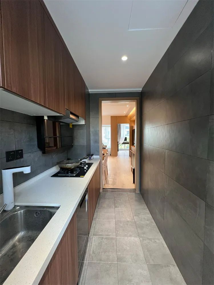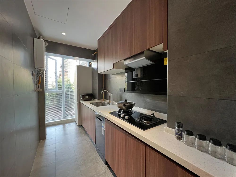 整個廚房空間雖然不大,采用直線型設計,通鋪的灰色柔光磚讓整個空間質感提升,簡約又安靜,櫥柜的門板,選擇實木刷木蠟油,保留原始樸素的質感。