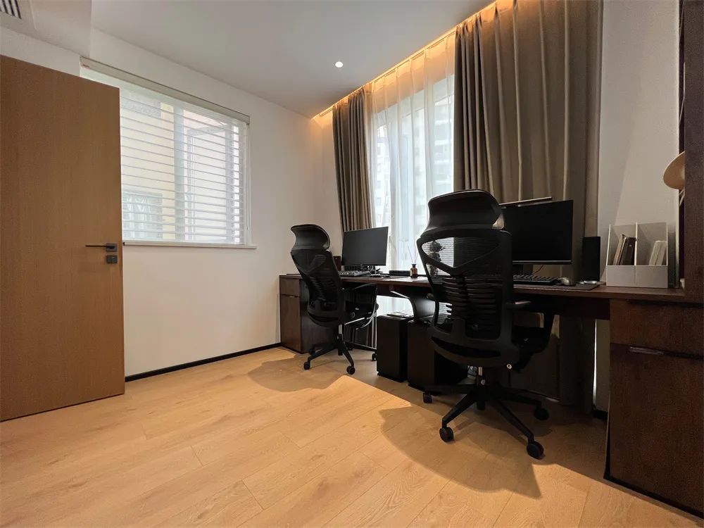 書房的裝修設計在色調上依然采用原木色與留白的設計手法,整體氛圍簡約大方,靠窗做了雙人書桌,可供兩人辦公學習,一面墻做了開放+封閉式書柜,既能滿足收納需求又能展示物品。