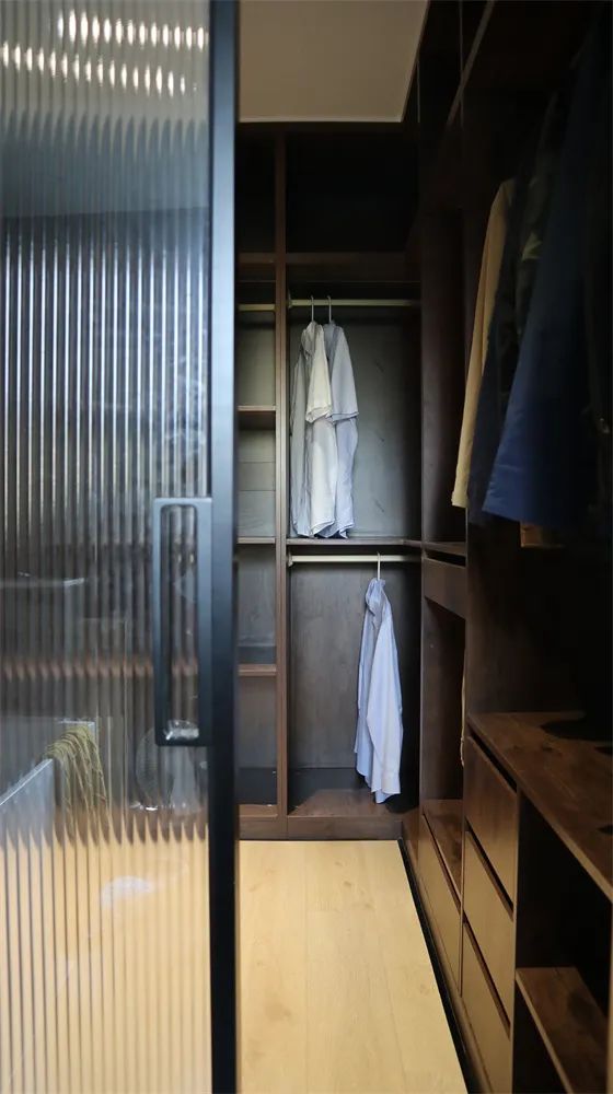 內設一個實木衣柜,以琉璃玻璃門為隔斷的衣帽間,呈現一個質感系空間,體現主人的對于生活品質的要求。
