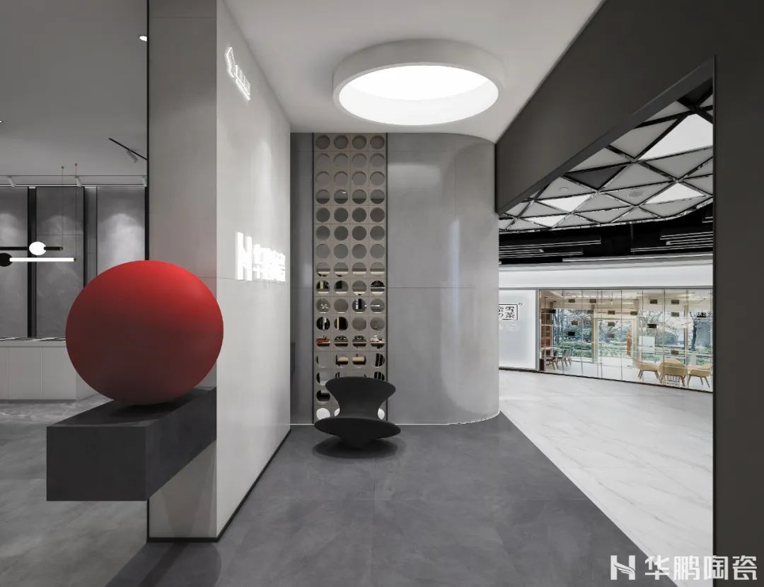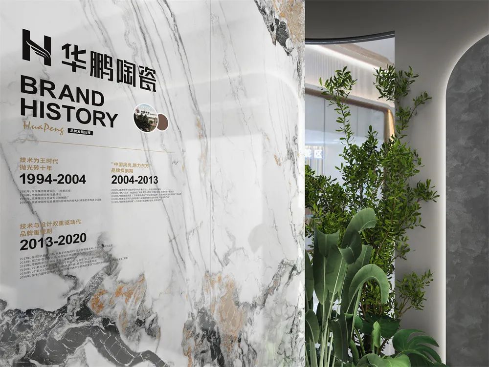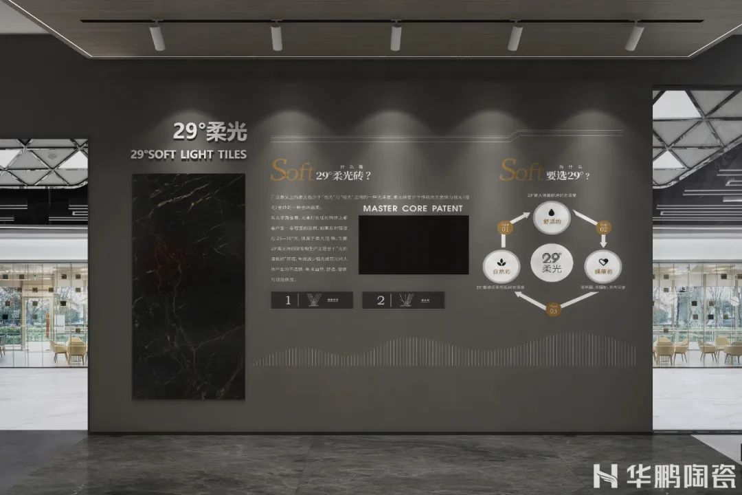 本模塊利用有限的空間用來展示品牌實力,是消費者全面了解華鵬陶瓷產品與文化的專屬場地,在設計上采用了灰色主色調,運用利落的線條,營造出品牌的厚重感。