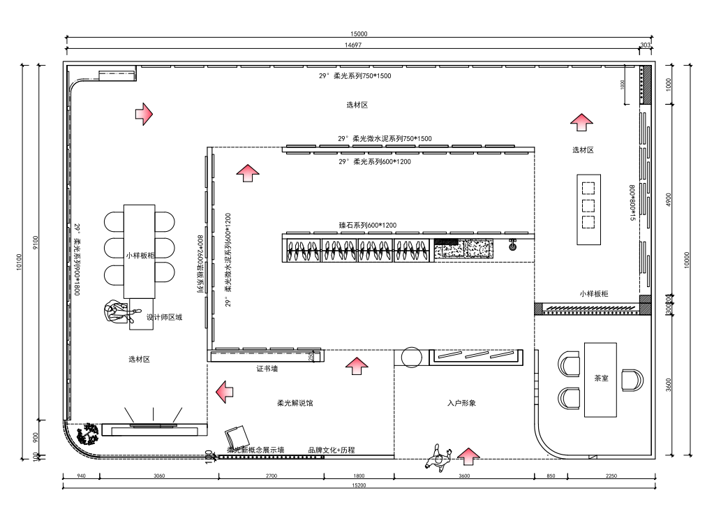 外立面以高端建材商場店面設計為參考,整個外立面突出品牌logo,強化產品IP(柔光磚,選華鵬),采用舒適的光度、簡練的線條、以簡約而又大氣的設計手法,充分展現了品牌的調性及強大氣場。