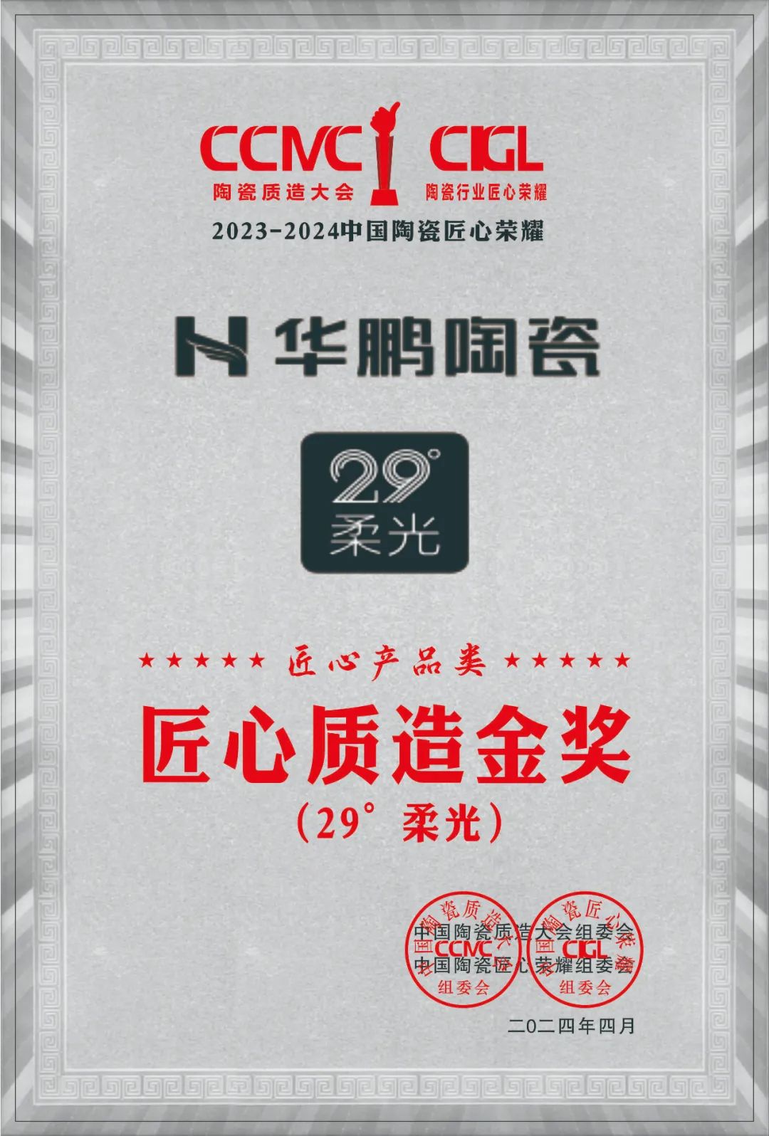 重磅榮譽 | 華鵬陶瓷憑實力斬獲「匠心質造金獎(29°柔光)」