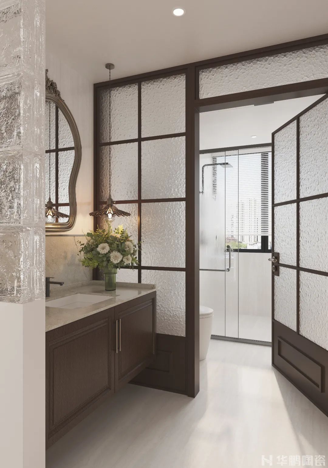 衛(wèi)浴空間則選用華鵬陶瓷立體柔光-羅馬洞石系列「意大利白洞」作為墻磚,暖白底色中糅合若隱若現的做舊紋理,既呼應整體色調,又為日常空間增添一抹復古煙火氣。設計師巧妙融入黃銅五金、琺瑯裝飾畫等元素,讓懷舊感與現代生活無縫銜接。