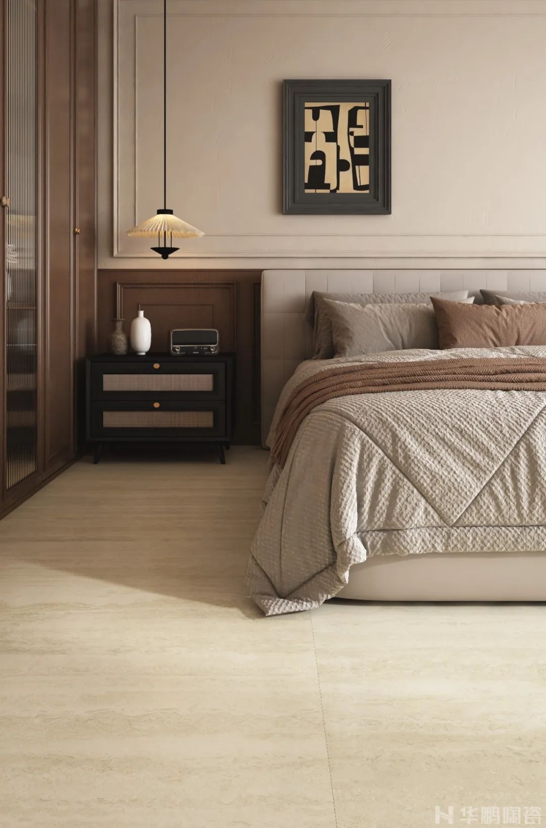 主臥延續(xù)復古基調,地面通鋪華鵬陶瓷立體柔光-羅馬洞石系列「意大利黃洞」洞石紋理磚,仿舊工藝還原了歲月打磨的溫潤質感。床頭背景墻采用線條雕花設計,搭配蕾絲紗簾與復古鏡面臺燈,細節(jié)處盡顯法式慵懶與精致,仿佛置身19世紀巴黎公寓。