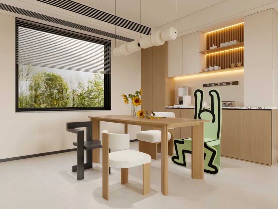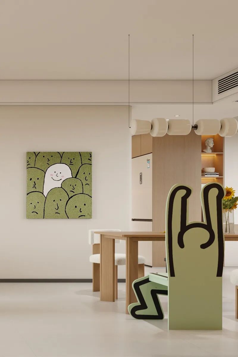 瓷磚細膩紋理在暖光下如奶油蛋糕紋路,搭配奶油色餐邊柜與淺木餐桌,為用餐空間添浪漫。即便擺滿餐具也不顯雜亂,餐后油污易清潔,不破壞奶油風氛圍。