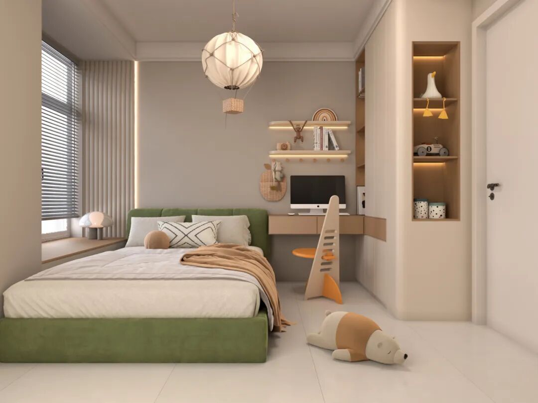Soft tones blend with bedding and curtains, bringing calm and comfort.