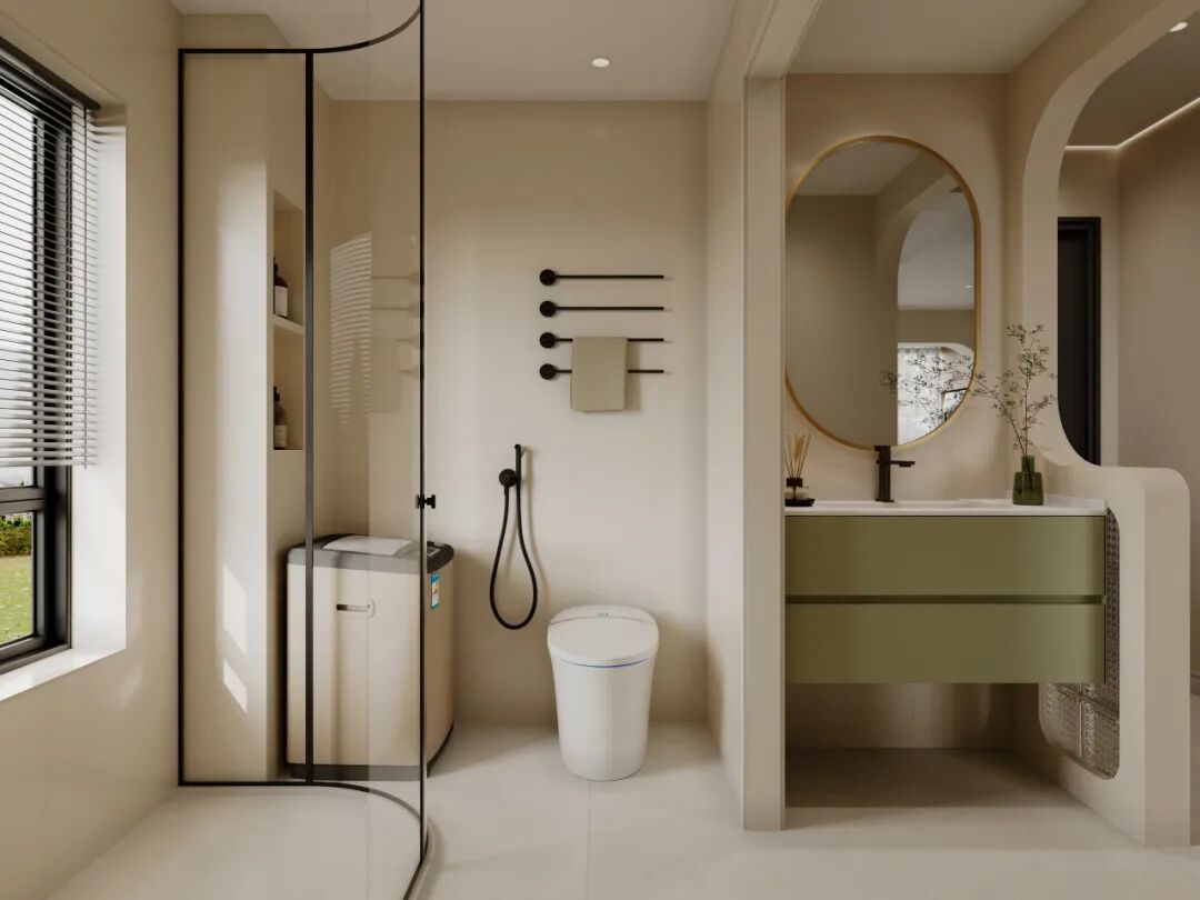 瓷磚防滑耐臟,水漬、泡沫擦后無痕,淺綠色浴室柜搭配淺灰色瓷磚,讓衛浴間潔凈雅致。綠植點綴,讓洗漱沐浴都成沉浸式享受。