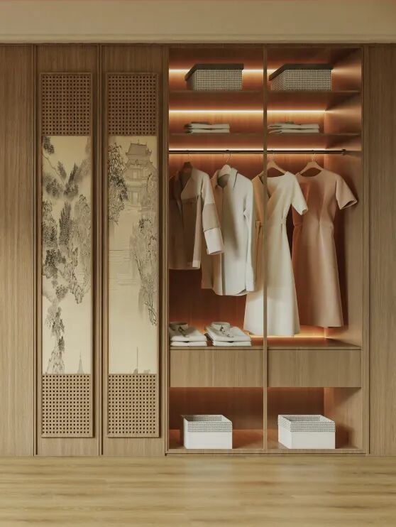 衣帽間以美觀實用為主,地面鋪設石晶地板系列「印·橡-經典咖」,溫潤的木紋肌理自帶古樸質感,與新中式風格相得益彰。石晶地板防水耐磨、打理便捷,適配衣帽間收納場景,讓空間更有禪意氛圍。
