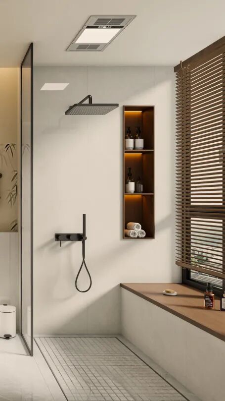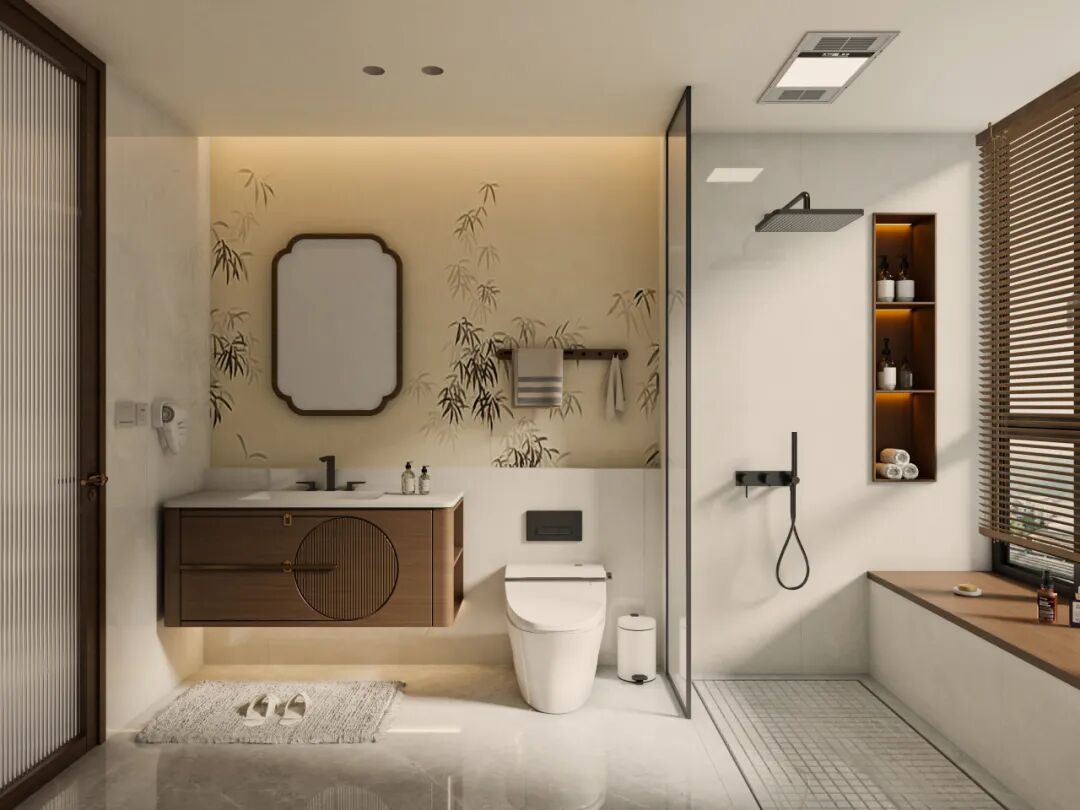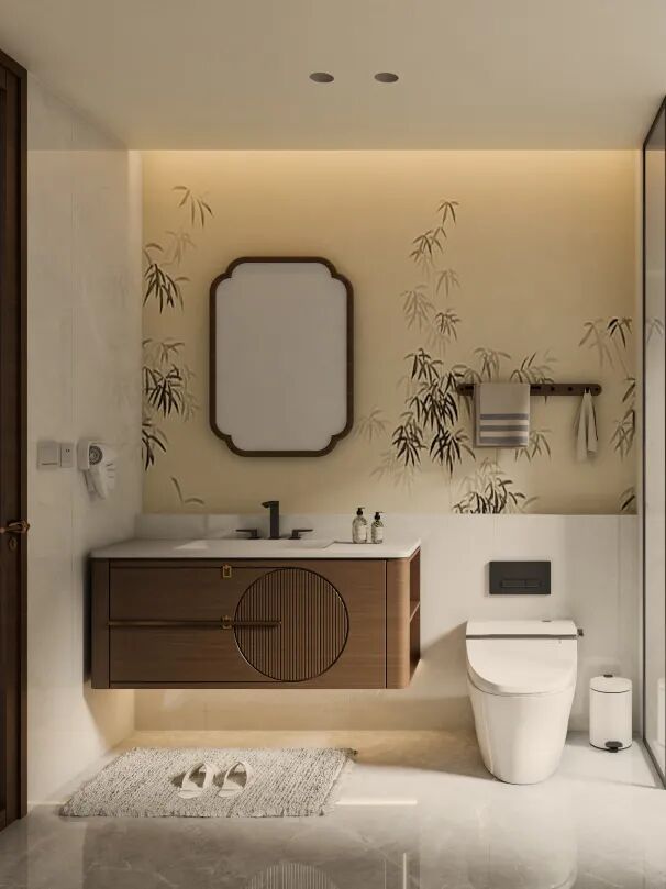 洗手間以清雅質感為主,墻地面統一選用天然石系列產品,營造整潔通透的新中式氛圍。地面鋪設天然石系列「洛可可淺灰」同款600*1200mm尺寸地磚,表面光滑易打理,適配衛浴潮濕環境;墻面搭配同系列「巖影淺灰」的600*1200mm規格,深淺灰調呼應,紋理自然連貫,消解了潮濕空間的沉悶感,讓沐浴時光更顯悠然愜意。
