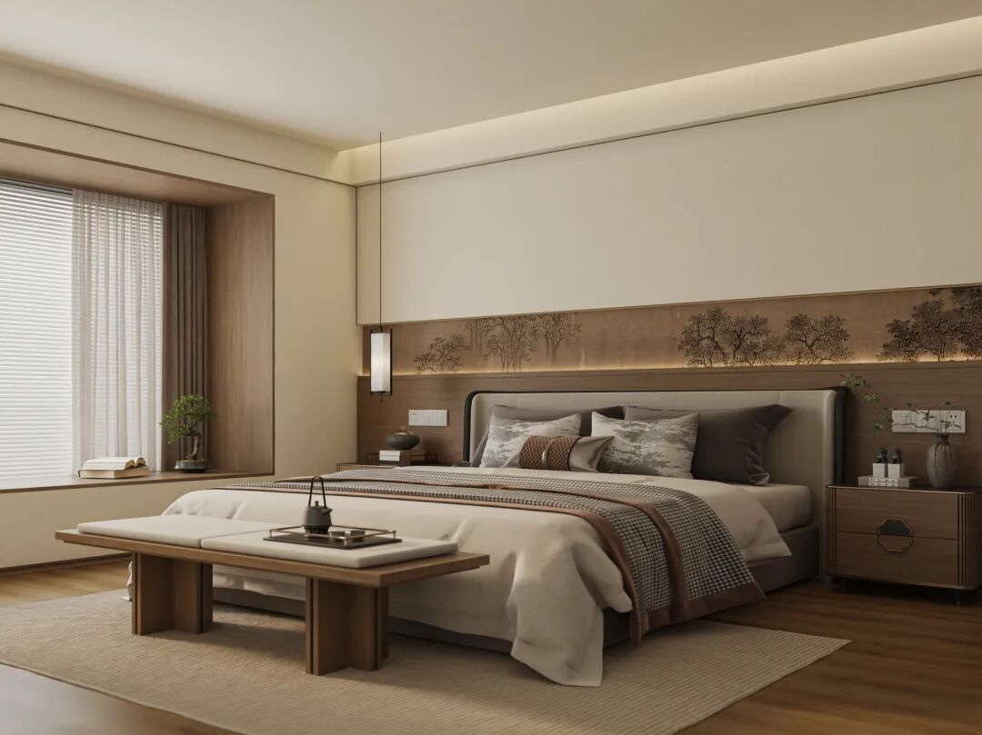 臥室以舒適好睡為核心,地面鋪溫潤石晶木地板·印橡-經典咖,墻面用綠色科技板·麻布素紋做背景墻,淺色調溫柔如月光。定制墻板:水墨樹影紋樣,非常有中式意境。且比墻布易清潔,環保基材,保障睡眠安心。